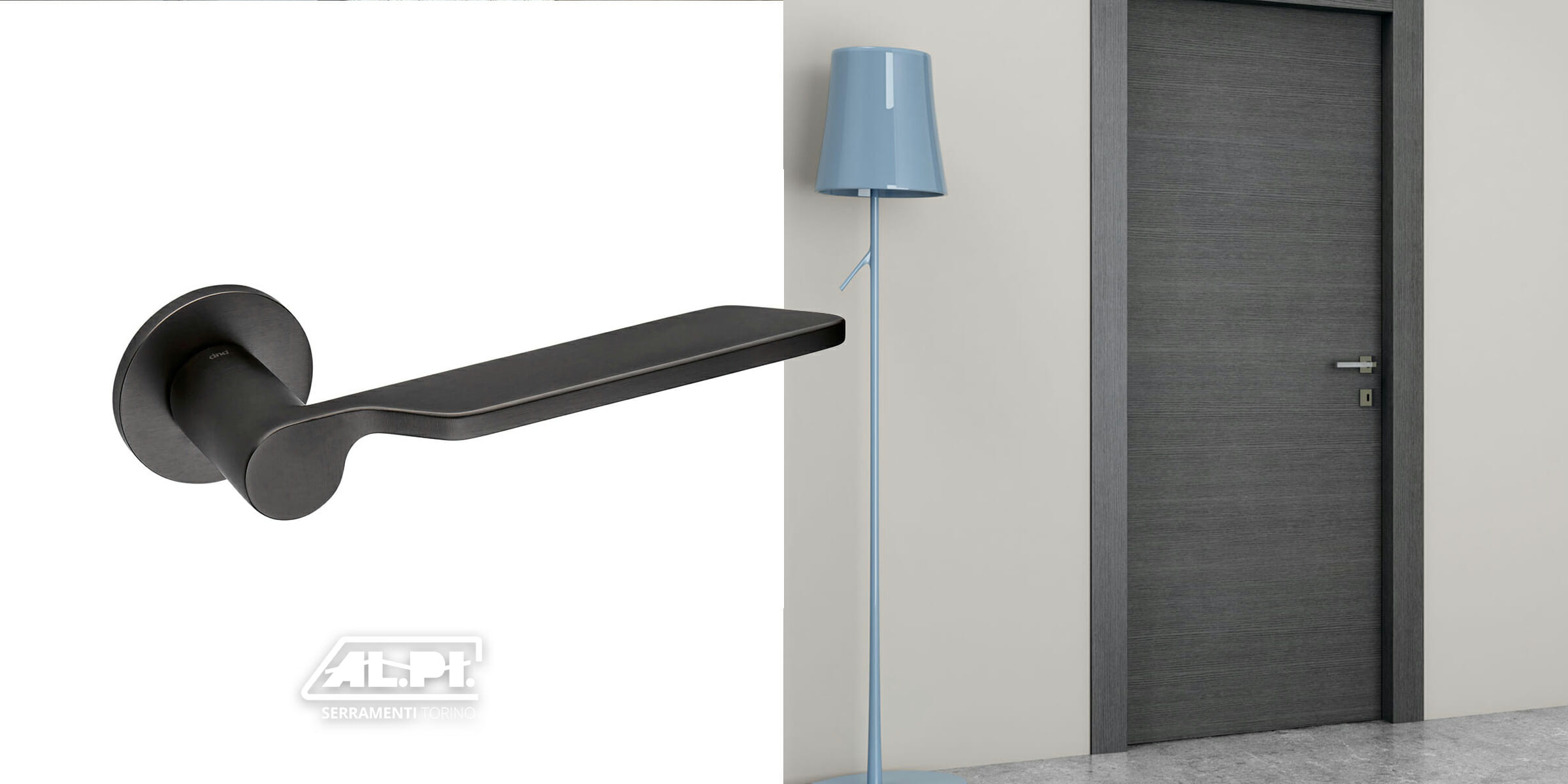 Maniglia DND Martinelli, Levante, in ottone, con finitura color grafite satinato. Forma tonda. Porta Italporte, Idea, color cenere.