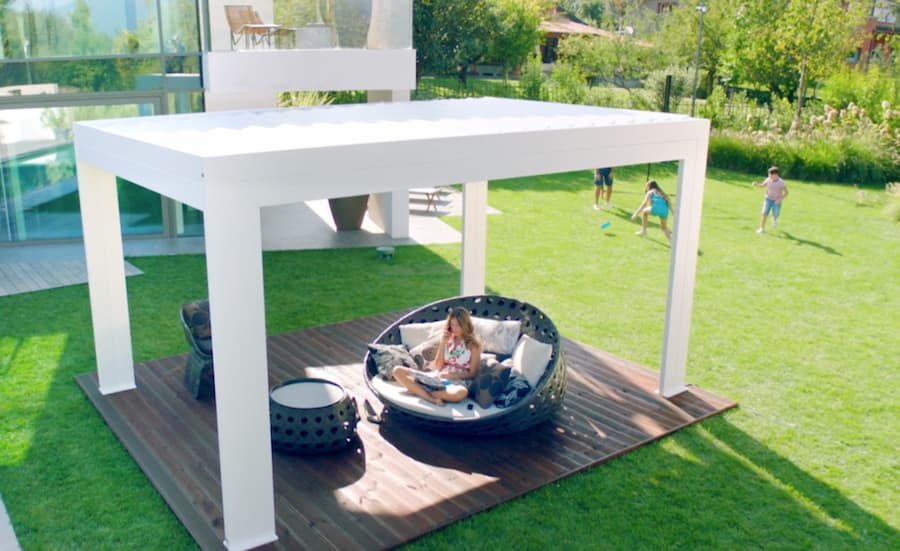 Pergolato bioclimatico: installazione in giardino, modello a penisola.